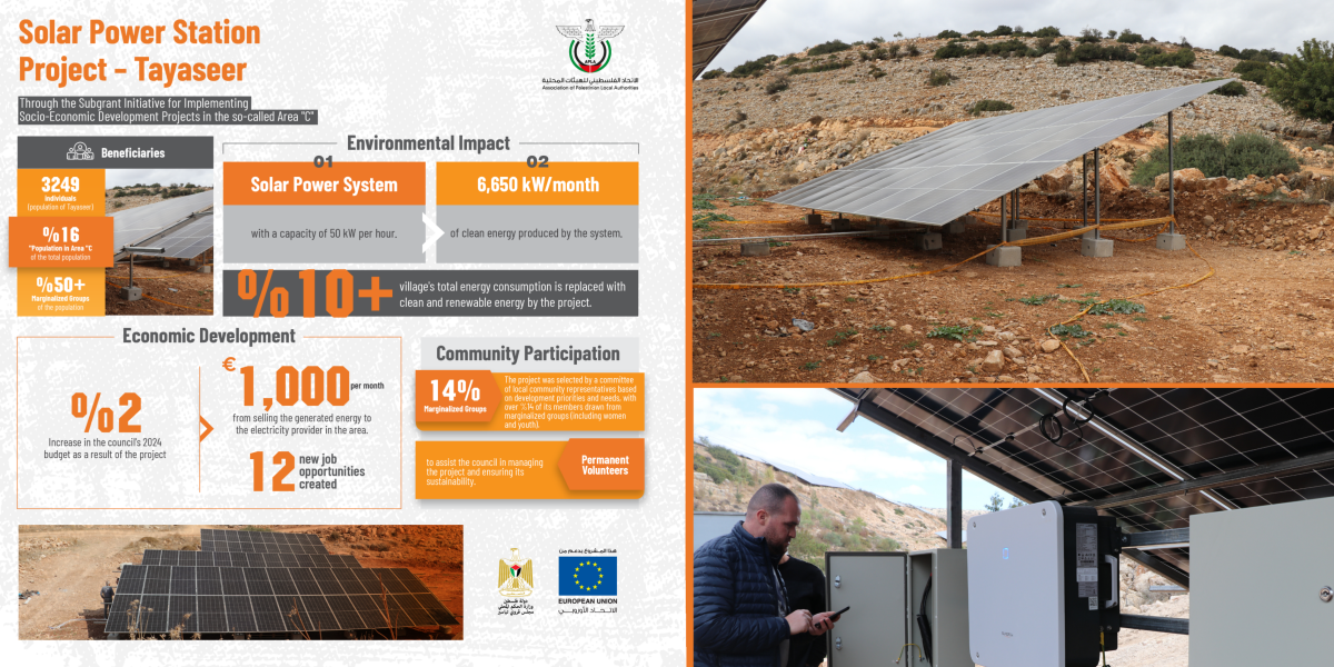 The “Solar Power Project – Tayaseer” is a strategic initiative under the Subgrant Program aimed at implementing social and economic development projects in the so-called Area “C.” The project benefits approximately 3,249 residents of Tayaseer, with 16% of the population living in Area “C” and more than 50% belonging to marginalized groups, including women, youth, and children. It addresses the community’s need for sustainable energy solutions while supporting local economic development.