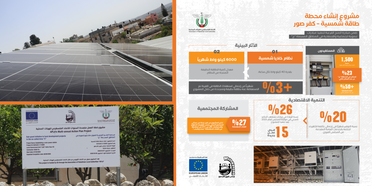 في قرية كفر صور غرب طولكرم، حيث يعيش نحو 1,500 نسمة بينهم 23% في المناطق المصنفة "ج" وأكثر من نصفهم من الفئات المهمشة من نساء وشباب وكبار سن، جرى تنفيذ مشروع "إنشاء نظام خلايا شمسية" كخيار عملي يخفف من أعباء القرية ويفتح مسارًا للاستدامة في بيئة تعاني من هشاشة البنية التحتية.