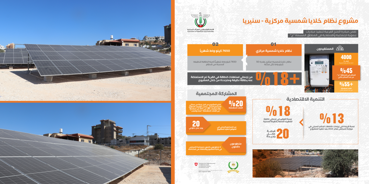 - خفض تكاليف الكهرباء الخاصة بالهيئة المحلية بنسبة 18%، الأمر الذي خفّف الأعباء المالية عن المجلس وأتاح تخصيص موارد إضافية لمشاريع تنموية أخرى، خاصة في المناطق المسماة "ج".
