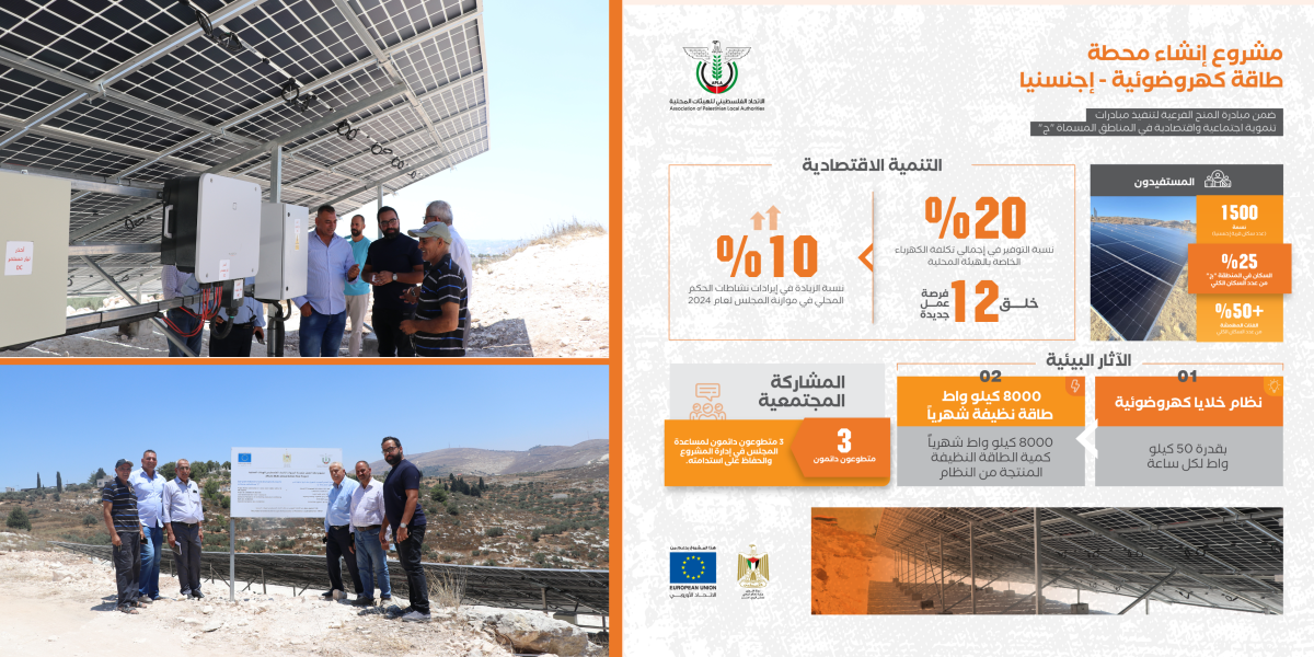 يُعد مشروع "إنشاء محطة طاقة كهروضوئية في قرية إجنسنيا" مبادرة نوعية ضمن برنامج المنح الفرعية الهادف إلى تنفيذ مشاريع تنموية اجتماعية واقتصادية في المناطق المسماة "ج". يستفيد من المشروع نحو 1,500 نسمة من سكان القرية، حيث يشكل سكان المنطقة المسماه "ج" ما نسبته 25% من العدد الكلي، فيما تزيد نسبة الفئات المهمشة عن 50% من إجمالي المستفيدين. ويهدف المشروع إلى توفير مصدر طاقة متجدد ونظيف يعزز استقلالية المجتمع المحلي في مجال الطاقة، ويقلل من التكاليف التشغيلية للهيئات المحلية، بما يسهم في تحقيق الاستدامة البيئية والاقتصادية وتحسين جودة الخدمات المقدمة للسكان.