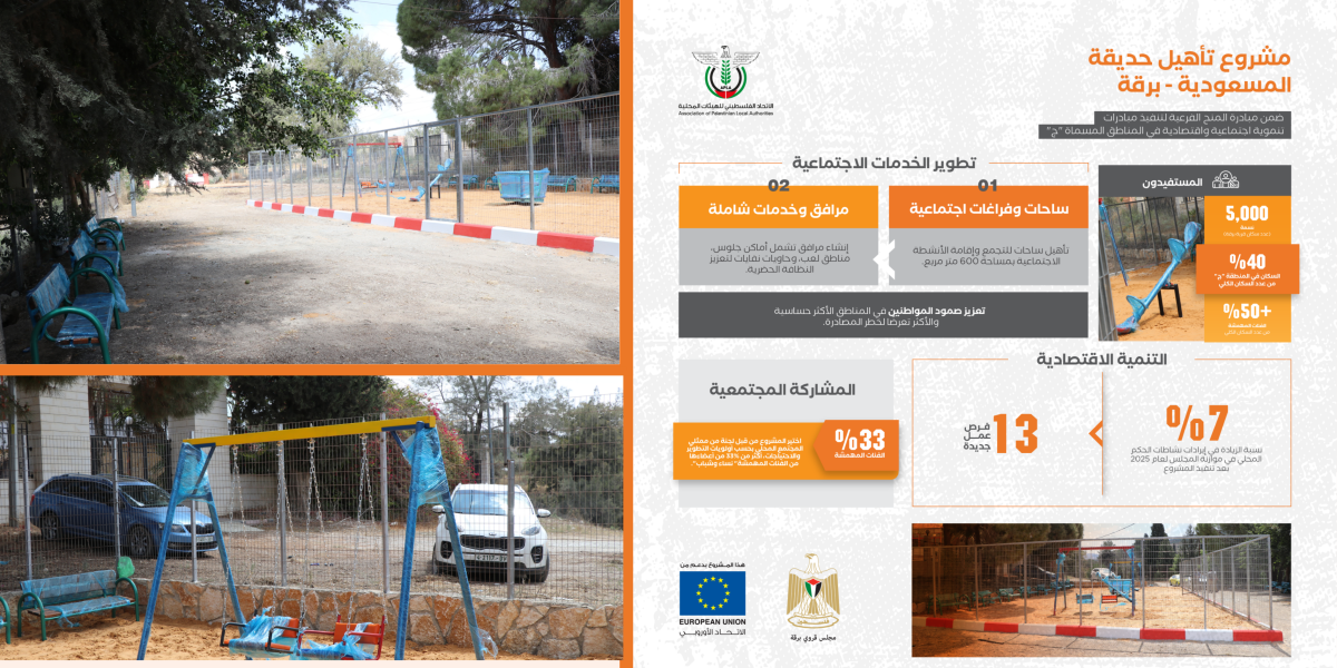وبينما يشتد الخناق على المسعودية، قررت برقة أن تجيب بفعل آخر: مشروع "تأهيل الساحات والمرافق العامة". ضمن برنامج المنح الفرعية، مشروع وُضع ليخاطب الناس في حياتهم اليومية، وليمنح أكثر من خمسة آلاف مواطن مساحة يلتقون فيها بأمان، بينهم أربعون في المئة من سكان المناطق المسماة "ج"، وأكثر من نصفهم من الفئات المهمشة من نساء وشباب. على أرضٍ تمتد لستمئة متر مربع، تحولت الساحات إلى فضاءات اجتماعية مؤهلة، تظللها أماكن جلوس، وتحتضن ألعابًا للأطفال، وتزدان بمرافق تحافظ على نظافة القرية وصورتها الحضرية.
