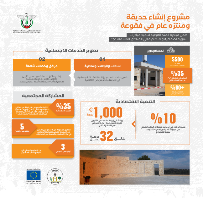 هذا المشروع جزء من برنامج المنح الفرعية الذي ينفذه الاتحاد الفلسطيني للهيئات المحلية في المناطق المسماة "ج". المبادرات المنبثقة عن هذا البرنامج ليست مجرد تحسين للبنية التحتية، بل أدوات عملية لتثبيت الناس في أرضهم، وتوسيع مساحات الحياة في وجه الحصار والمصادرة، وتحويل التنمية إلى فعل صمود يومي يحفظ الحق والذاكرة والوجود.